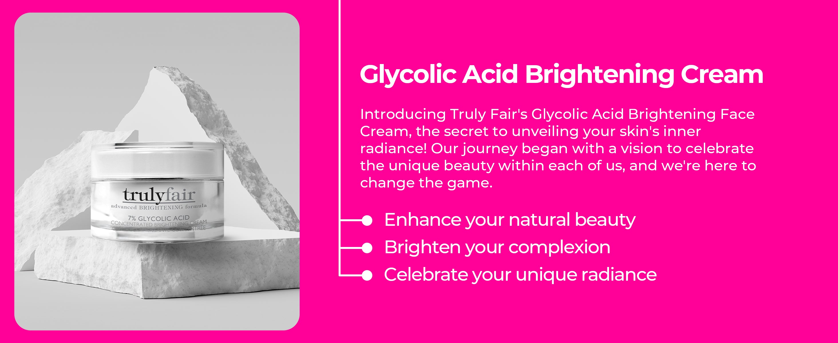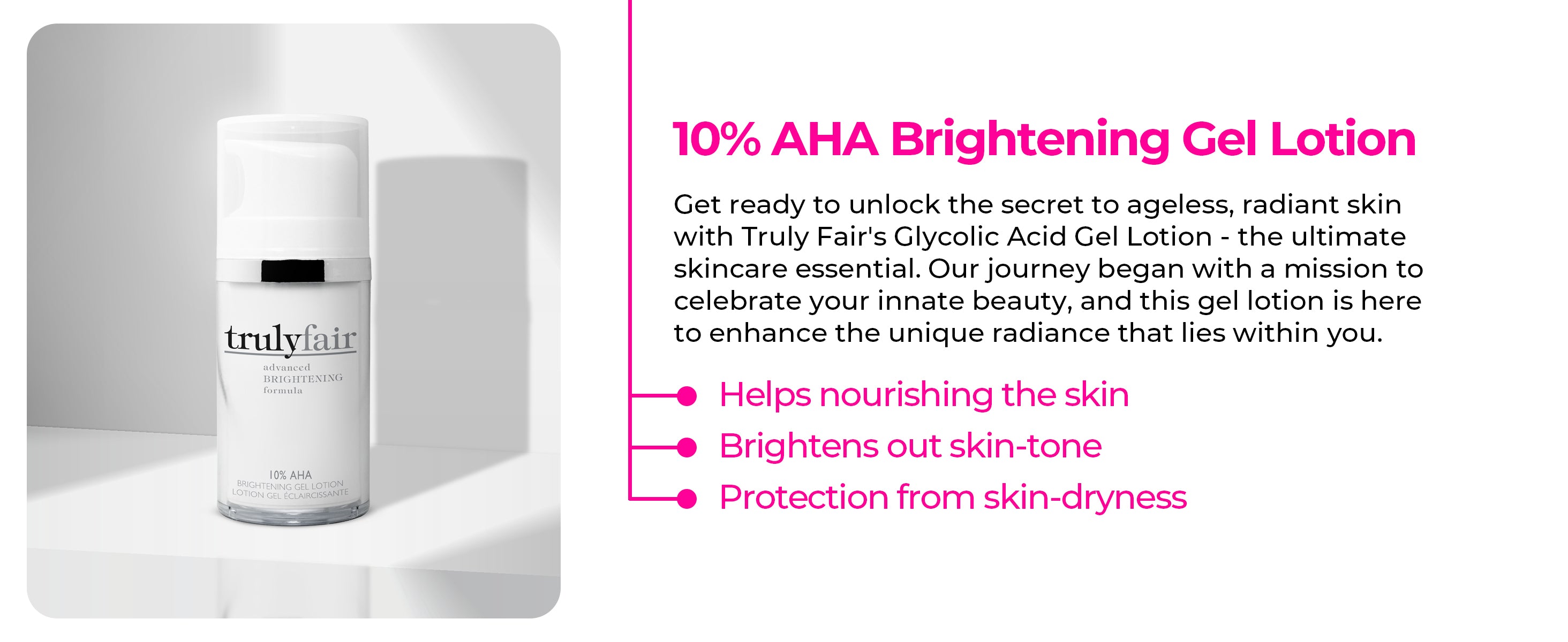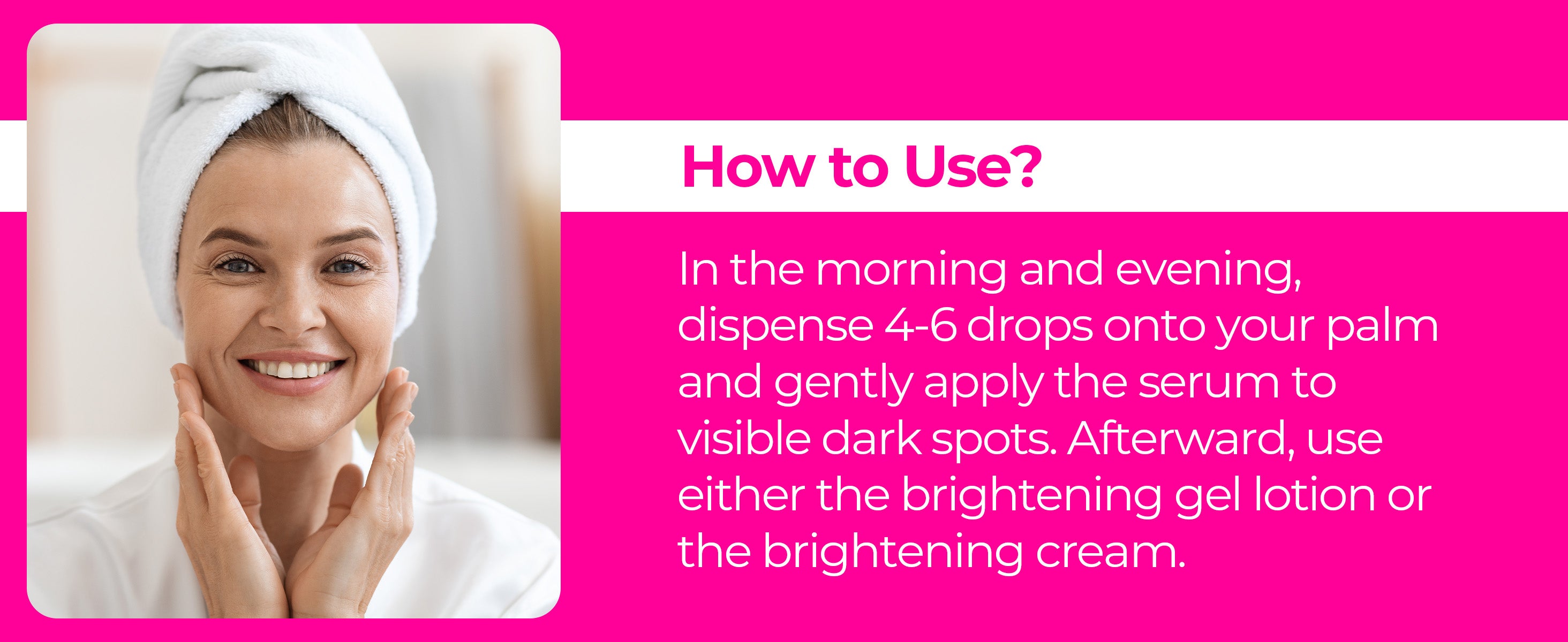 In the morning and evening, dispense 4-6 drops onto your palm and gently apply the serum to visible dark spots. Apply the 10% AHA brightening gel lotion to get that perfect glow, when used in the morning or apply the trulyfair 7% Glycolic Acid Concentrated Brightening Cream when used in the evening.